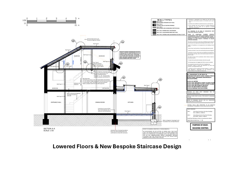 • Lowering first floor ceiling to create head height in the loft.